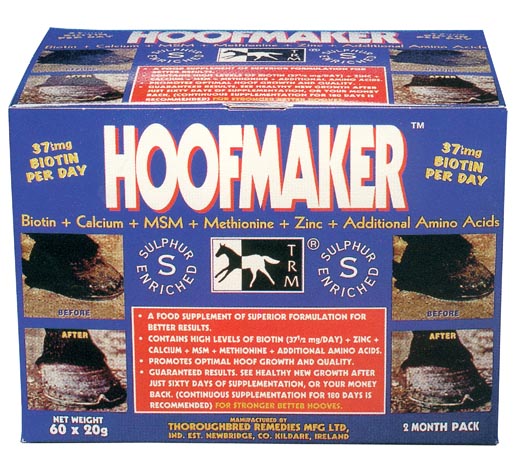 Хуфмейкер концентрат– высокоэффективная, наиболее полная по составу, кормовая добавка для копыт в гранулах. Хуфмейкер содержит все необходимые нутриенты для оптимального роста, укрепления и повышения амортизационных свойств копытного рога. Высокое содержание биотина и биодоступной серы повышает прочность и сохранность копыта. Кератина Сульфат обеспечивает копыто межклеточным веществом. Цинк имеет первостепенное значение для нормального заживления эпидермальной ткани, особенно копыт. Цинк – составной элемент металлоэнзима, необходимого для синтеза белка. Аминокислоты – незаменимые элементы белков, являются необходимыми составляющими копытного рога. Дозировка и способ применения: Хуфмейкер добавляют в обычный кормовой рацион: - Взрослым лошадям – 50 г в день. - Пони и жеребятам – 50 г через день. Для достижения наилучшего результата рекомендуется применять Хуфмейкер в течение180 дней. Рост копыта будет заметен возле коронарной зоны уже через месяц после начала применения. Состав на 1 порцию (50 граммов): Метионин 6,000mg Биотин 37.5mg Кальций 5,105mg Медь 120mg Гистидин 200mg Цинк 600mg Глицин 455mg Пролин 340mg Изолейцин 170mg Глутаминовая к-та 1,465mg Аланин 295mg Аргинин 650mg Аспатриновая к-та 625mg Цистеин 95mg Лизин 335mg Лейцин 395mg Фенилаланин 285mg Серин 375mg Треонин 235mg Тирозин 220mg Валин 215mg TRM, Ирландия